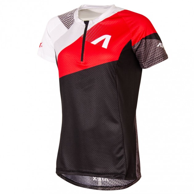The jersey has a short zipper on the front with stop slider and top cap, round neckline with low hem, short raglan sleeves, bottom edge of sleeves and jersey is curved without elastic. The seams and joints of the parts are minimized in the underarm area, their positioning and rounded shape increase comfort during running.