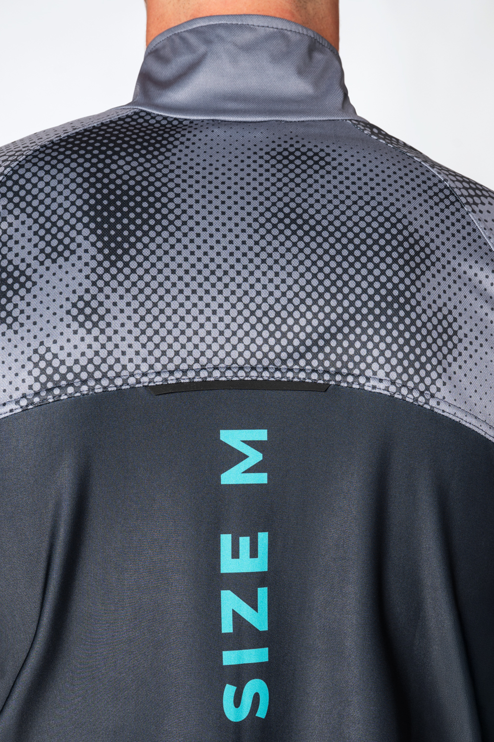 The raglan sleeves with elasticated underarm section are finished with an elasticated hem and feature an inner elasticated cuff with thumbhole as standard. The bottom edge of the jacket contains a non-slip silicone rubber to prevent sliding out when running. There are distinctive reflective elements on the front and back.