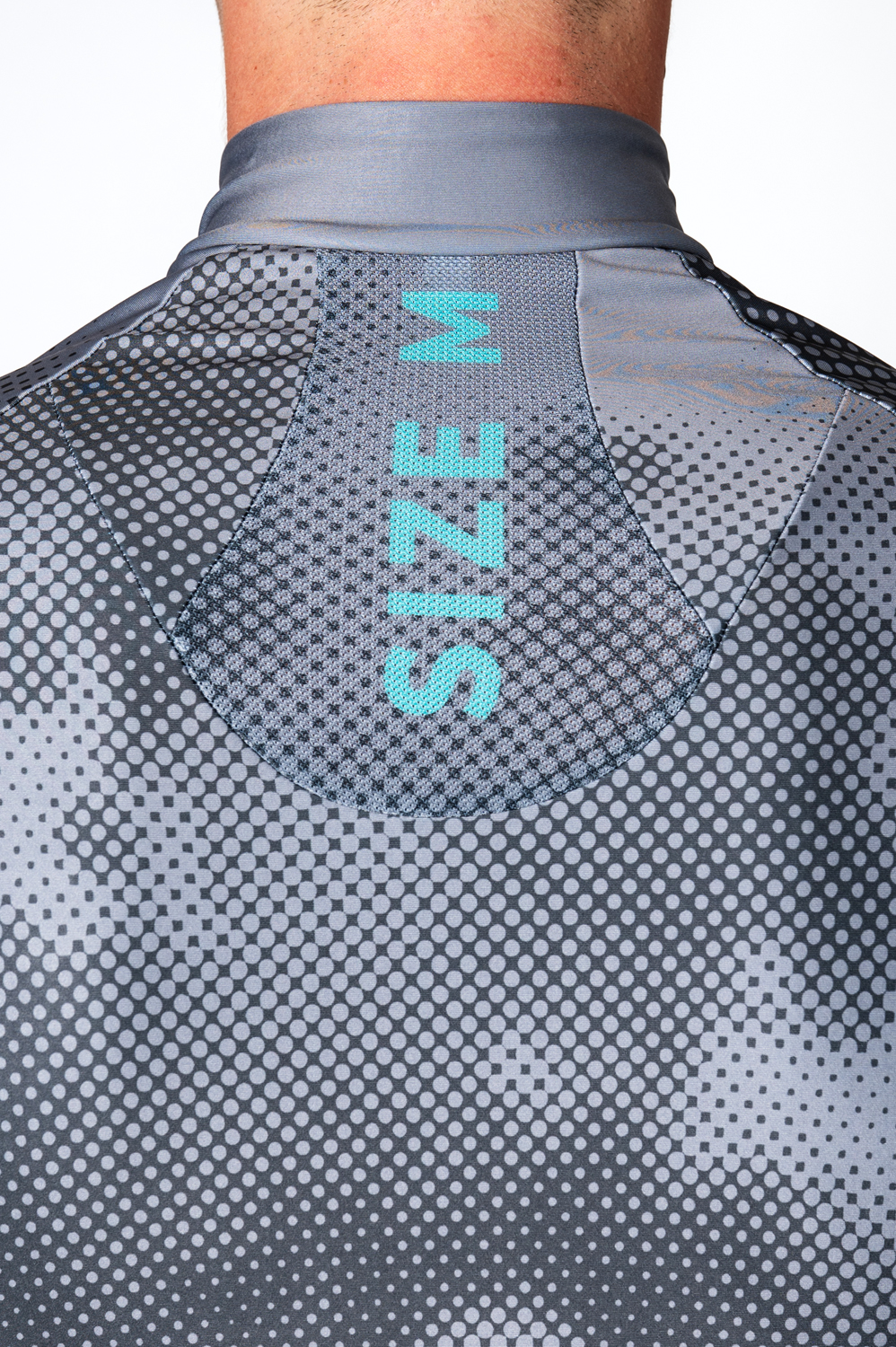 There is a short lined zipper with a cap on the front of the jersey. The raglan sleeves are finished with an elasticated hem. The bottom edge of the jersey is fitted with non-slip silicone rubber to prevent it from rolling up when moving.