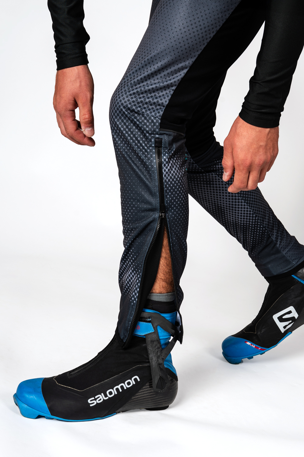 The PROFI long cross-country pants have a semi-fitted anatomically shaped cut. There is an elasticated waistband with a drawstring and two zipped pockets with stop sliders on the front. The legs have waterproof lined zippers to below the knee, allowing for easy dressing over shoes. The lower edges of the legs are finished with a hemming elastic. There are distinctive reflective elements on the back.