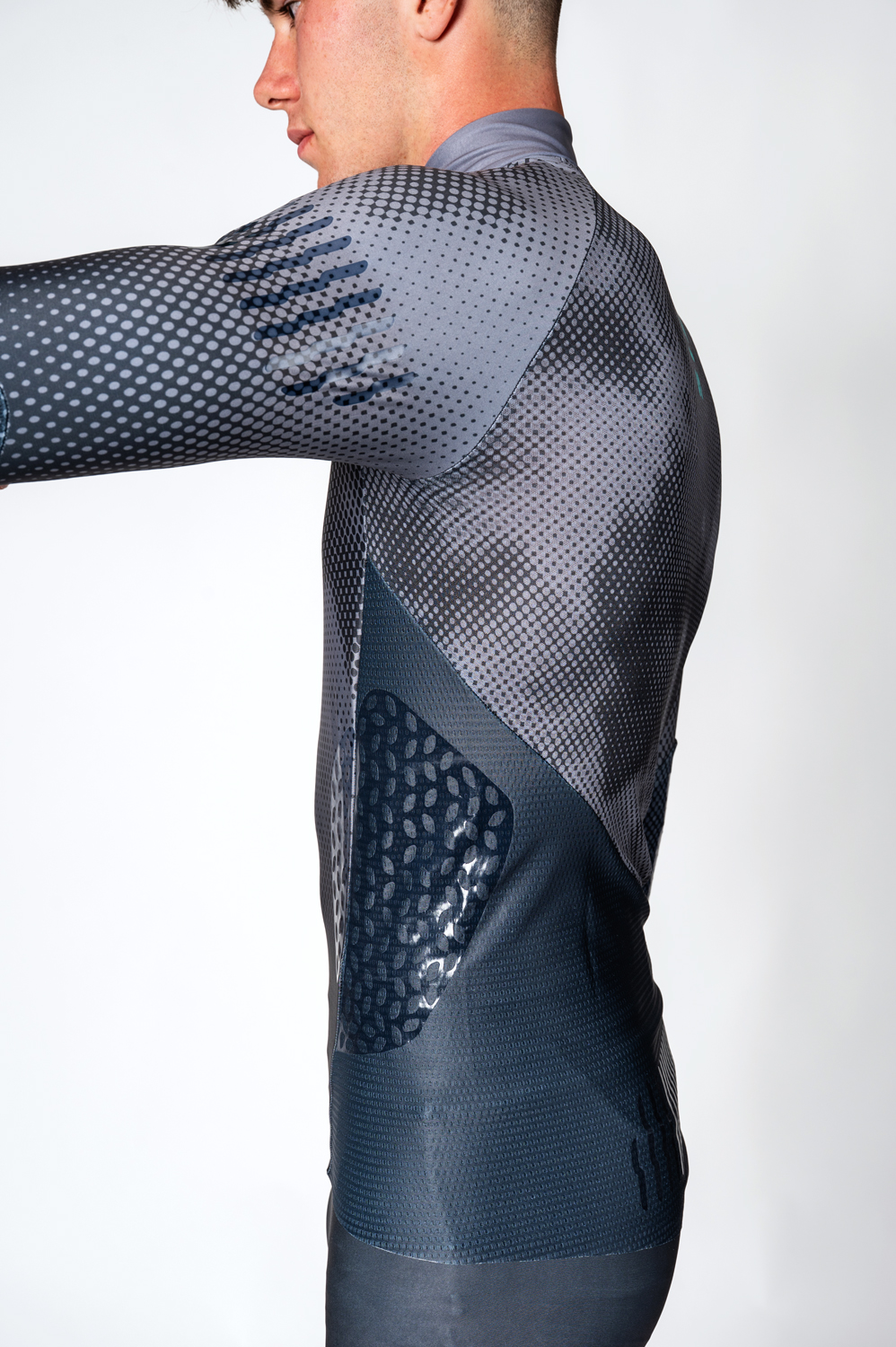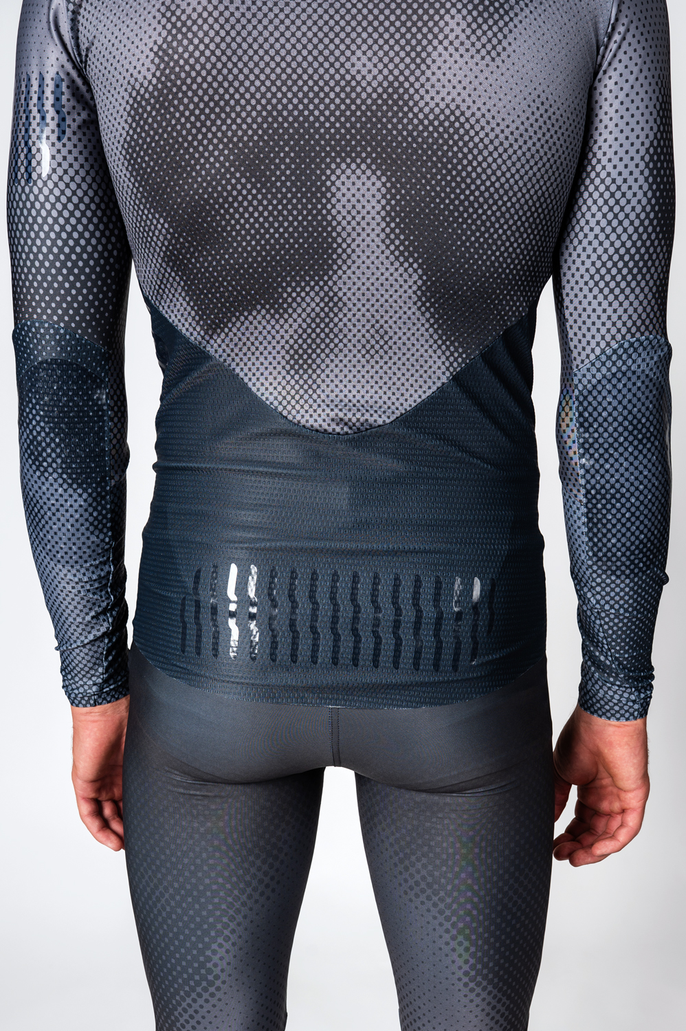 The centre panel of the jersey and the upper part of the sleeves are made of ESPAN FIT material - an adaptable, soft material with increased abrasion resistance. The side panels, lower sleeves and back are made of VELARO LIGHT material, which has an aerodynamic structure that promotes air circulation and rapid ventilation while remaining sufficiently strong. To increase breathability, the upper back and underarms are made of MESH CUBE, a fine mesh fabric that provides maximum freedom of movement and a perfect fit to the body shape