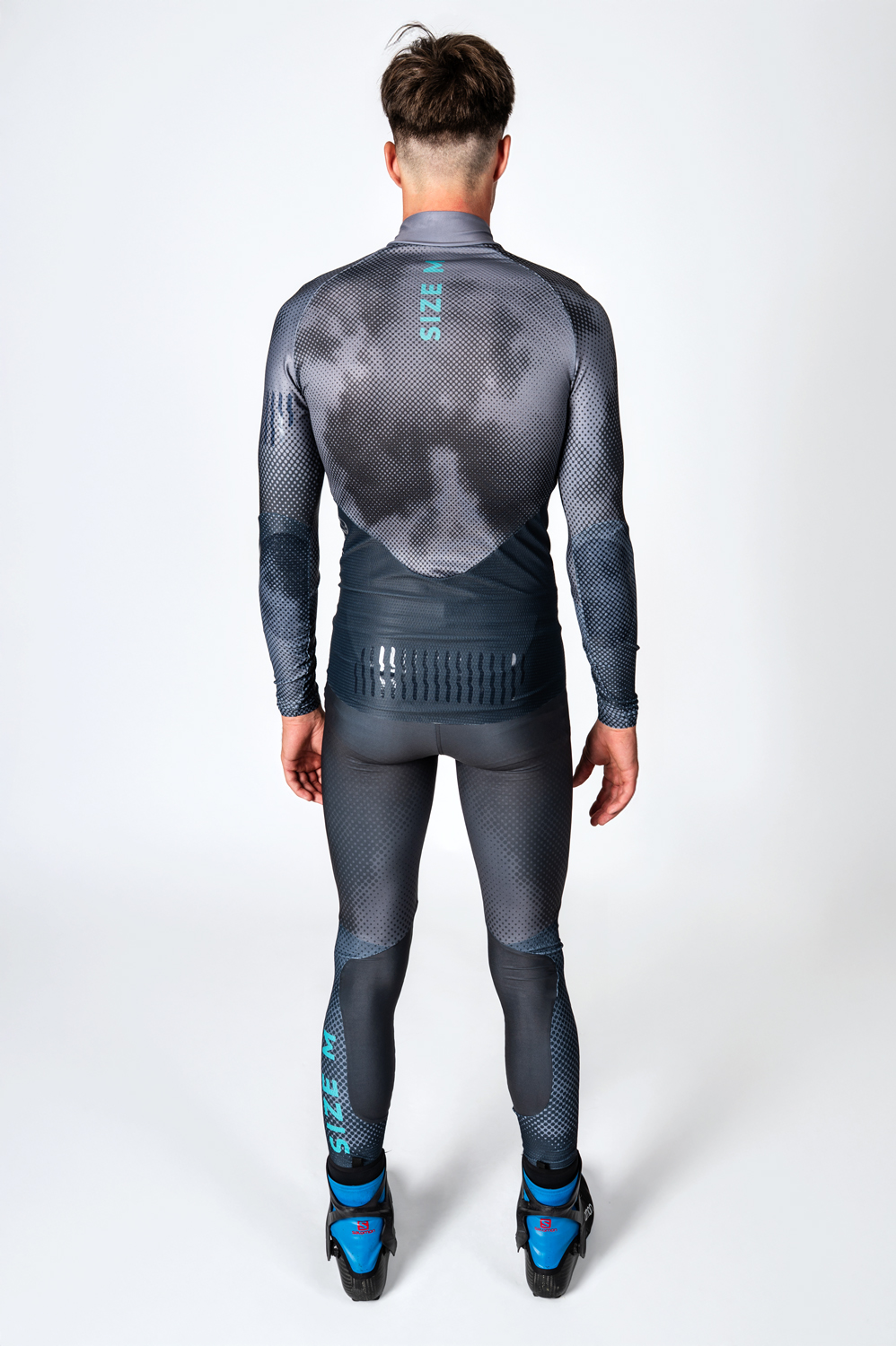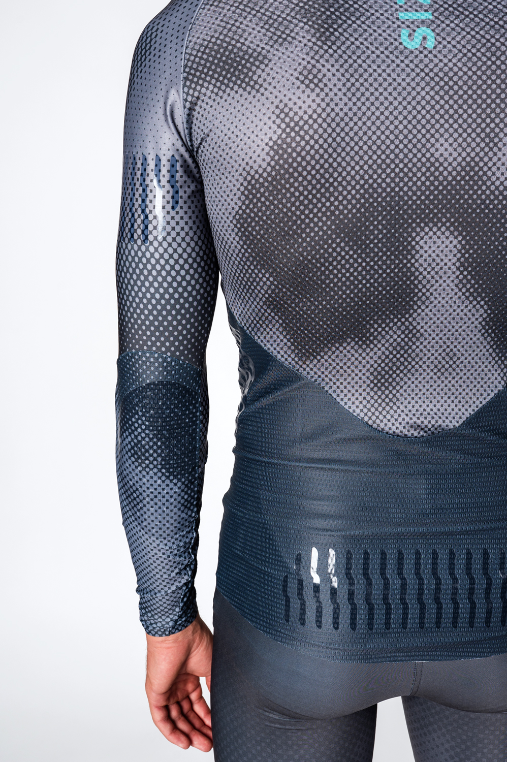 The jersey has a sophisticated, very close-fitting cut that hugs the body tightly. The combination of functional materials and thoughtful details meets the expectations of race performance. The jersey features a short lined zipper with a cap. The neck stand is lowered in the front and the inside is lined with sweat-wicking material for added comfort. The raglan sleeves are articulated and finished with a glued, threadless technology. The torso is made up of three panels - the centre section is softly finished with a threadless underbend. The remainder of the jersey's bottom edge is taped with a non-slip silicone strip that eliminates jersey shifting during movement. The jersey includes non-slip biathlon grips for added stability when handling the weapon, on the biceps, side panels and both elbows.