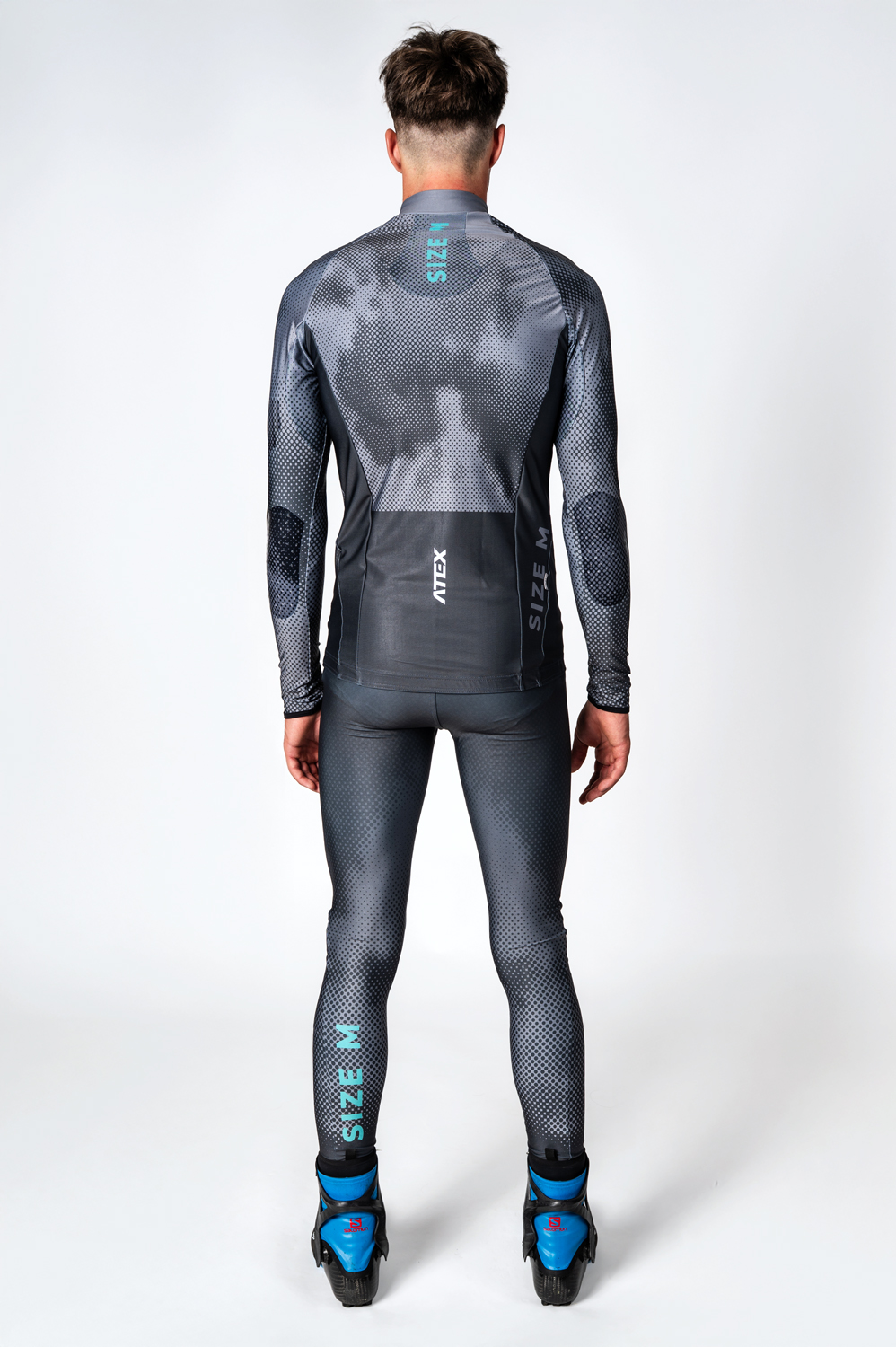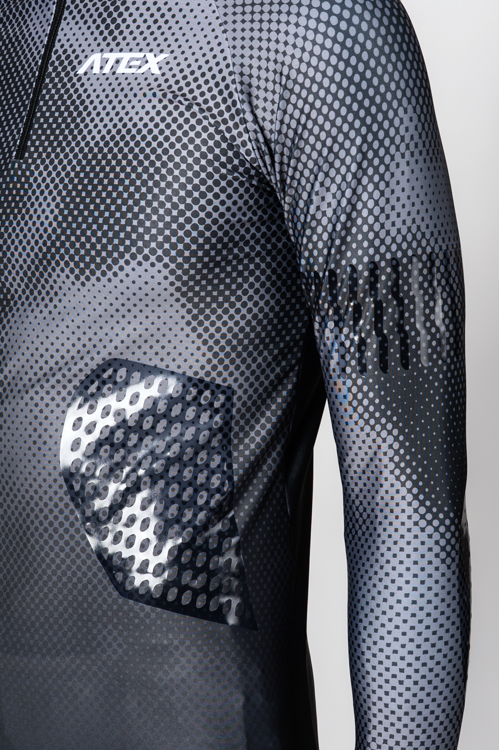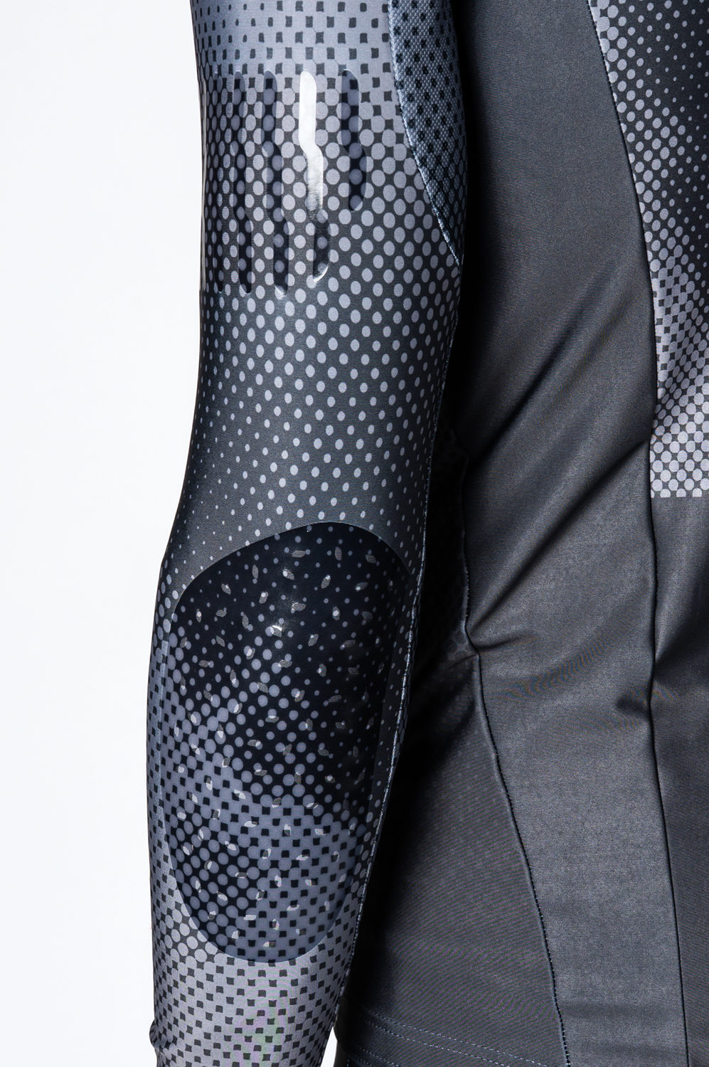 The front of the jersey has a short, padded zipper with a cap. The raglan sleeves are finished with an elasticated hem. The bottom edge of the jersey contains a non-slip silicone elastic to prevent rolling out when moving.The jersey includes non-slip biathlon grips for added stability when handling the weapon, on the biceps, side and both elbows.