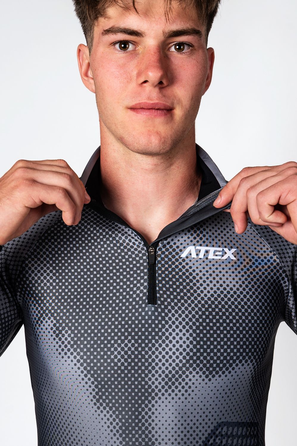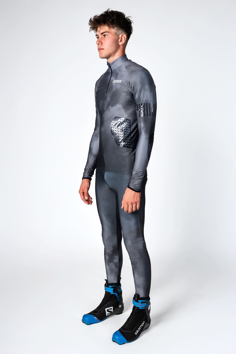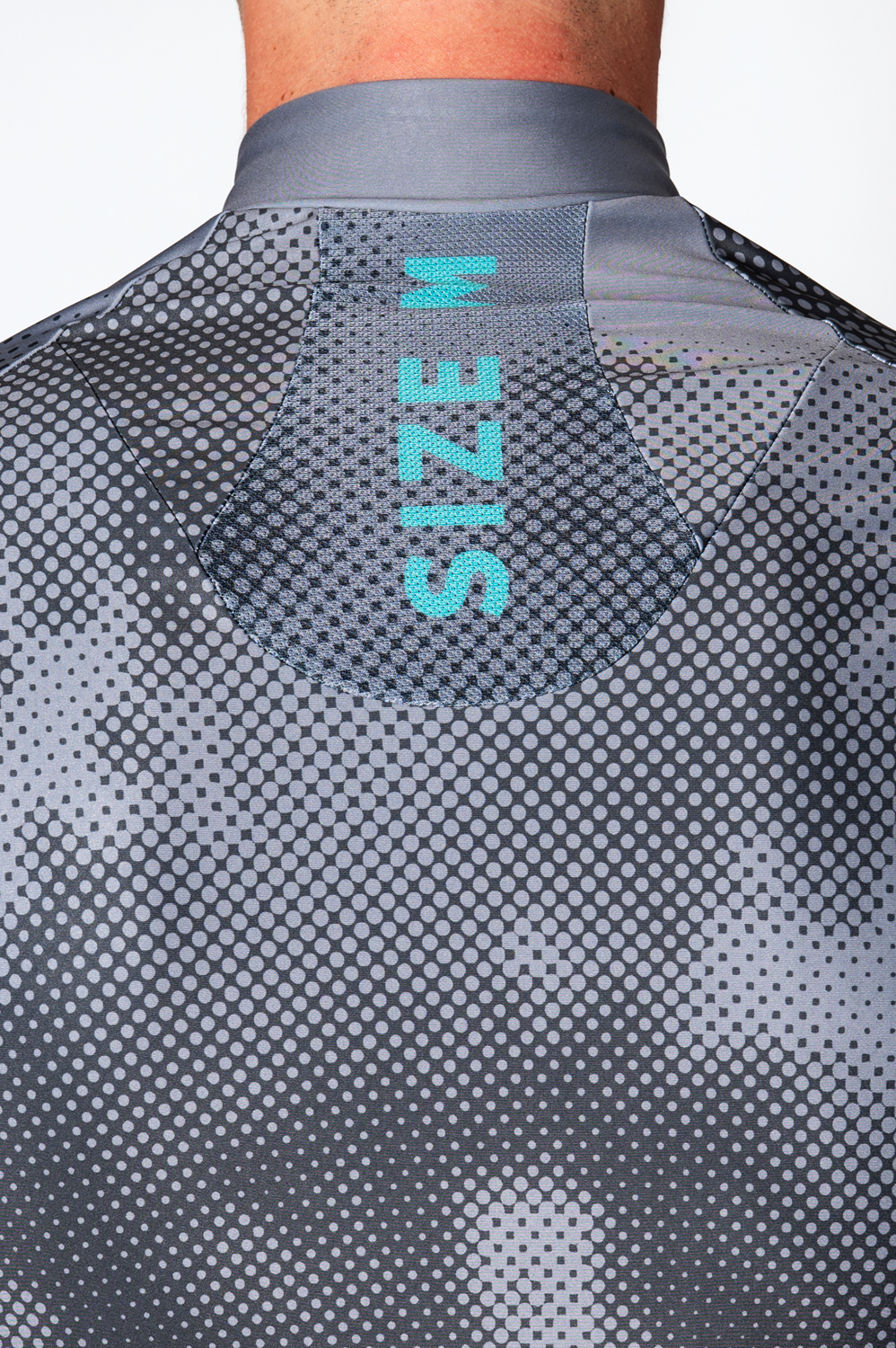 The front of the jersey has a short, padded zipper with a cap. The raglan sleeves are finished with an elasticated hem. The bottom edge of the jersey contains a non-slip silicone elastic to prevent rolling out when moving.The jersey includes non-slip biathlon grips for added stability when handling the weapon, on the biceps, side and both elbows.