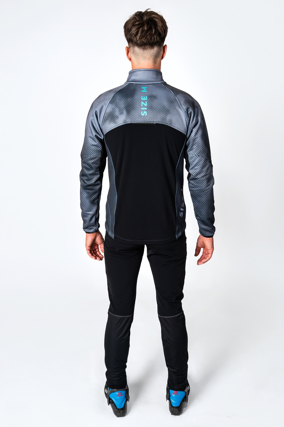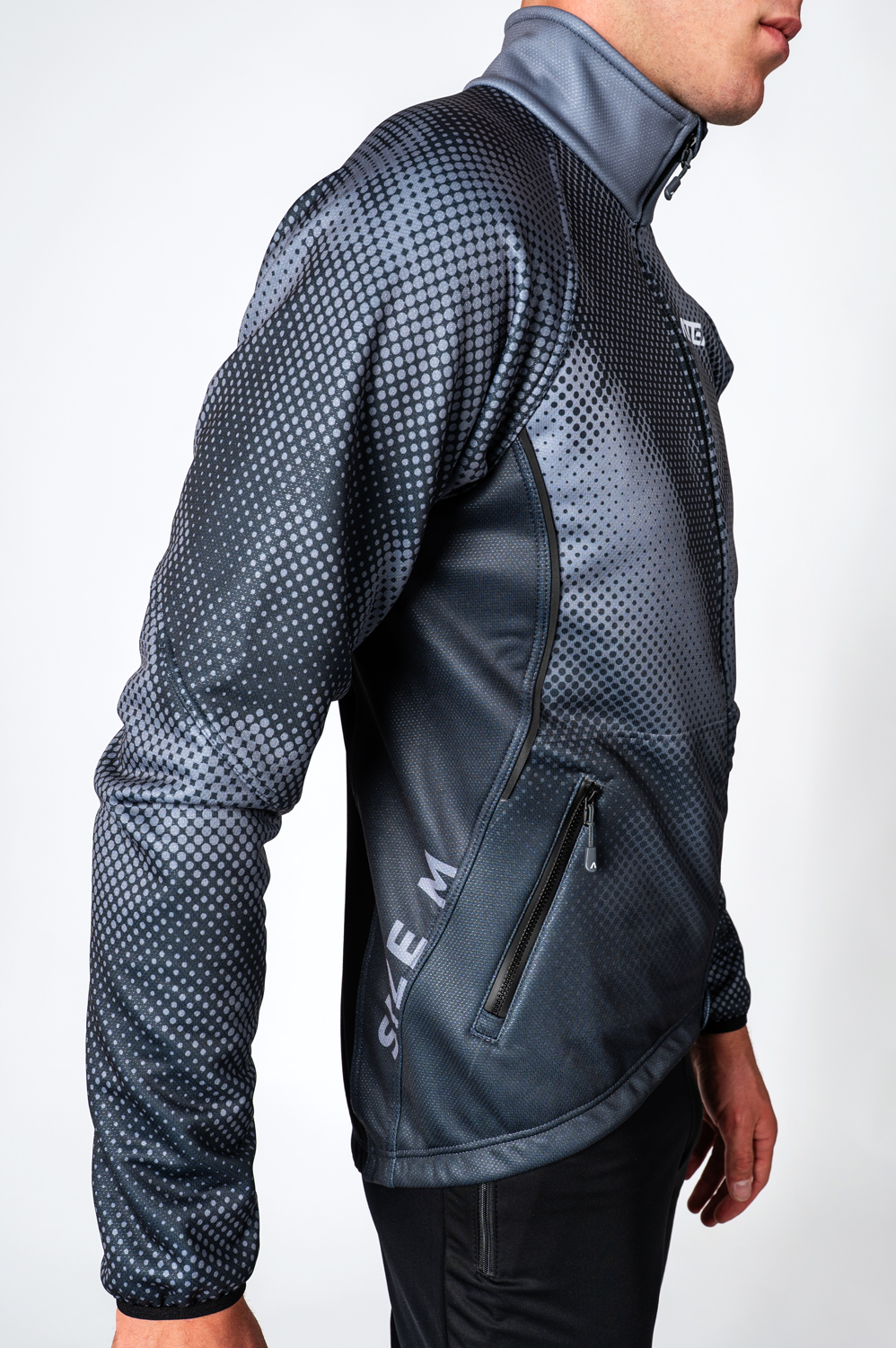 The SPORT running jacket has a semi-fitted cut and is made in a combination of two materials - the main part of the warm three-layer membrane material ZEROWIND THERMO (a material with high wind and water resistance, while maintaining breathability, with a surface treatment for water drainage). The centre back and back of the sleeves at the armpits are made of a very stretchy, soft ROUBAIX material for increased breathability and better range of motion.