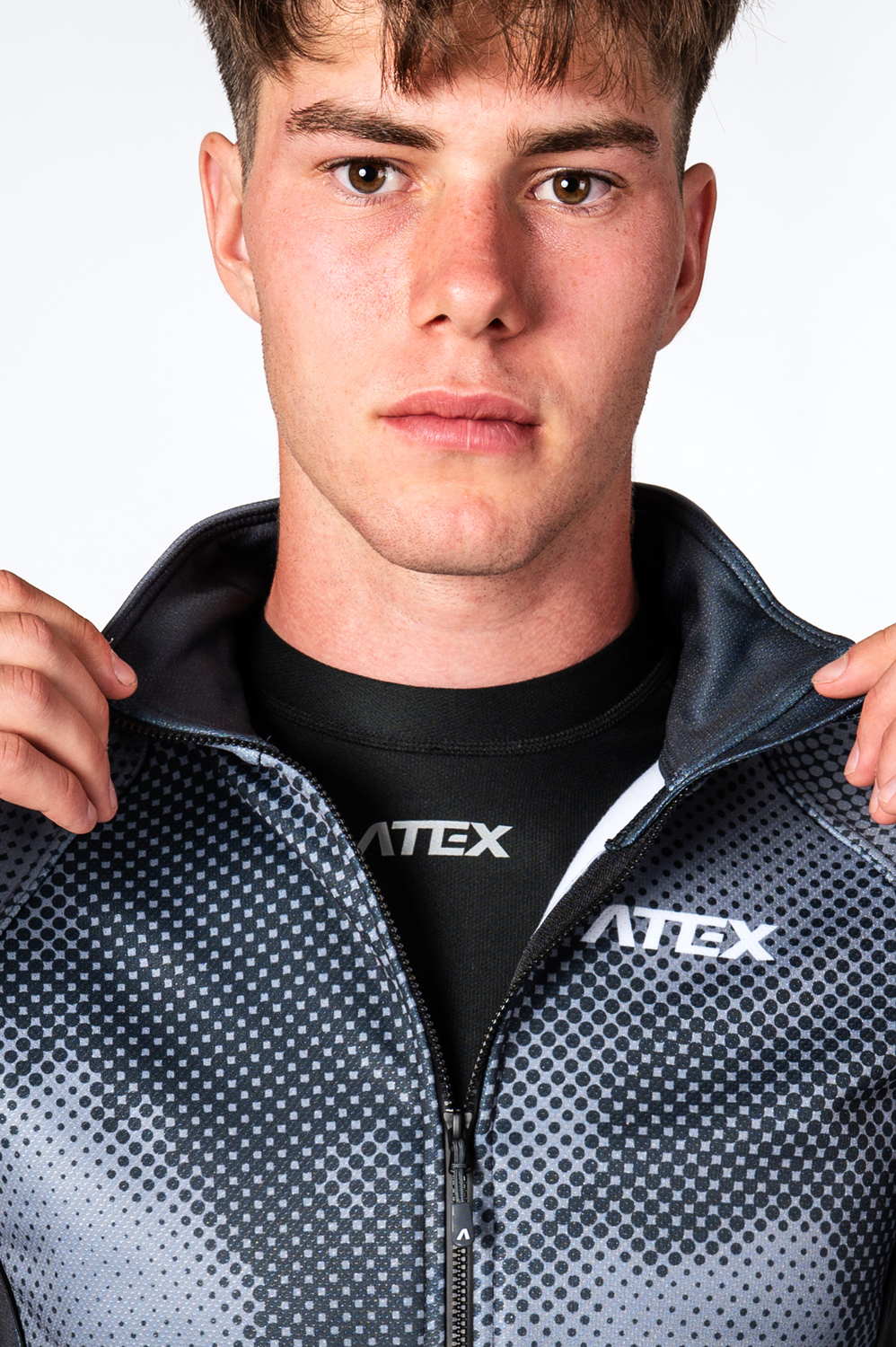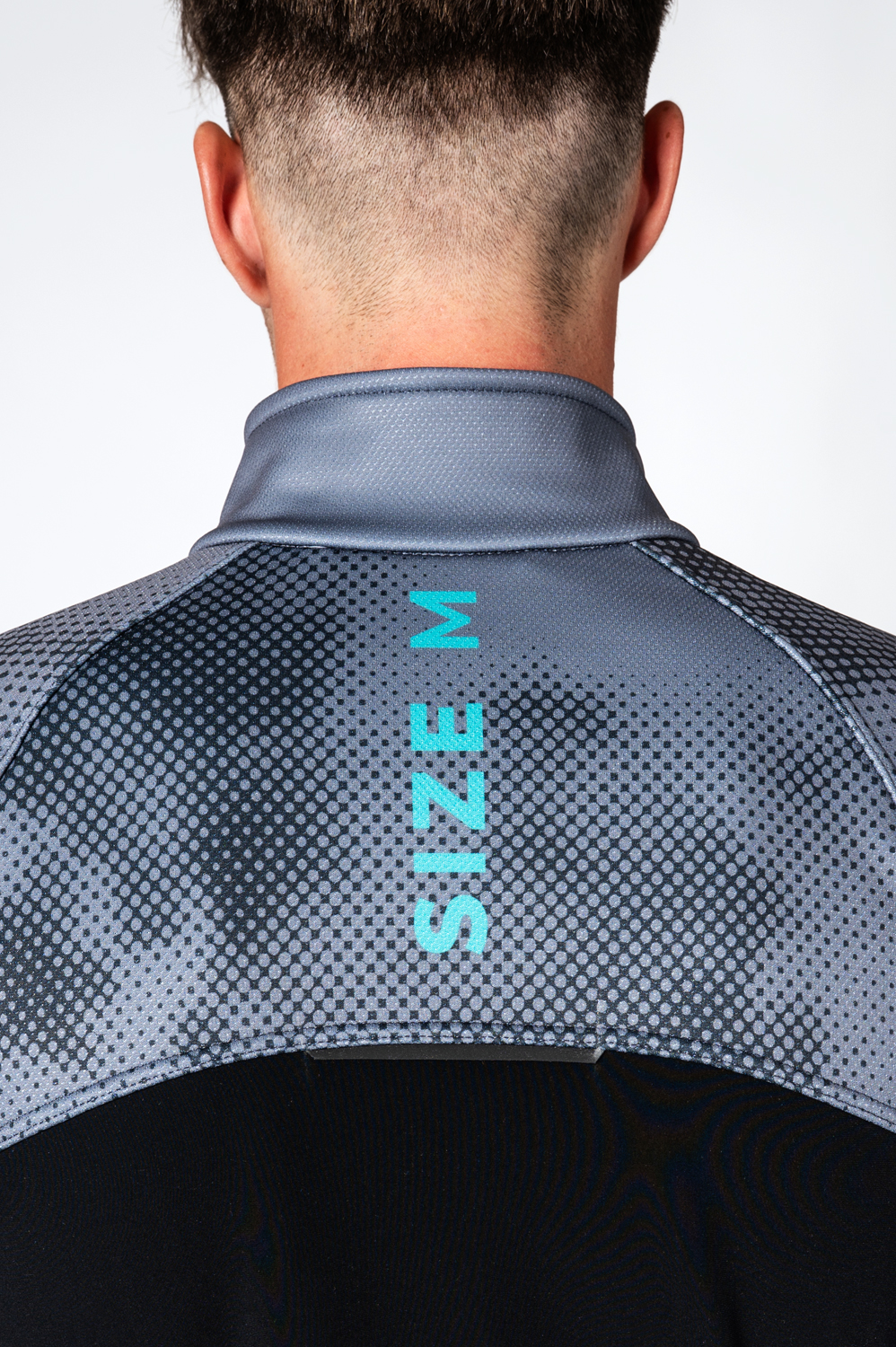 Optional zipped chest pocket, rear zipped pocket or the areas shown in the picture can be printed in grey.