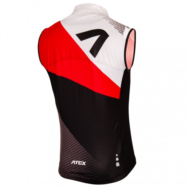 Long full-length front zip with stop slider and caps on both sides, armholes lined with soft stretchy material, bottom edge of the vest finished with silicone non-slip elastic. Reflective safety elements on the back.