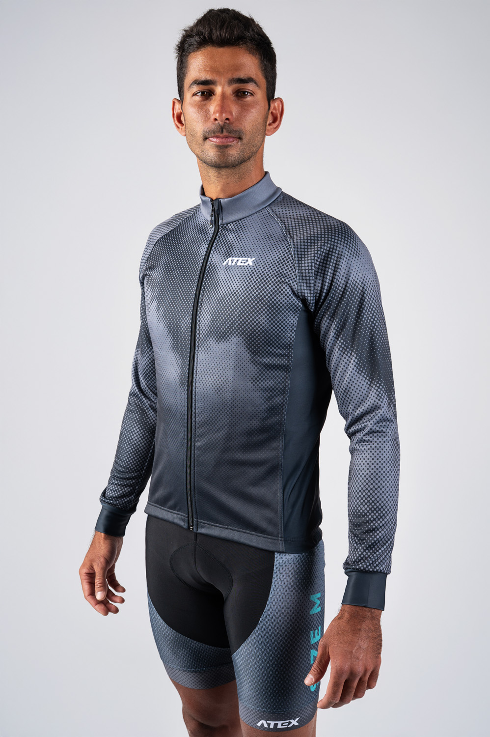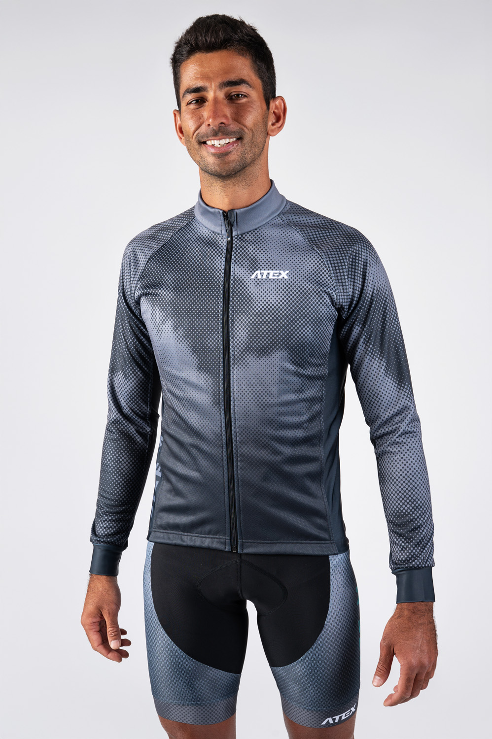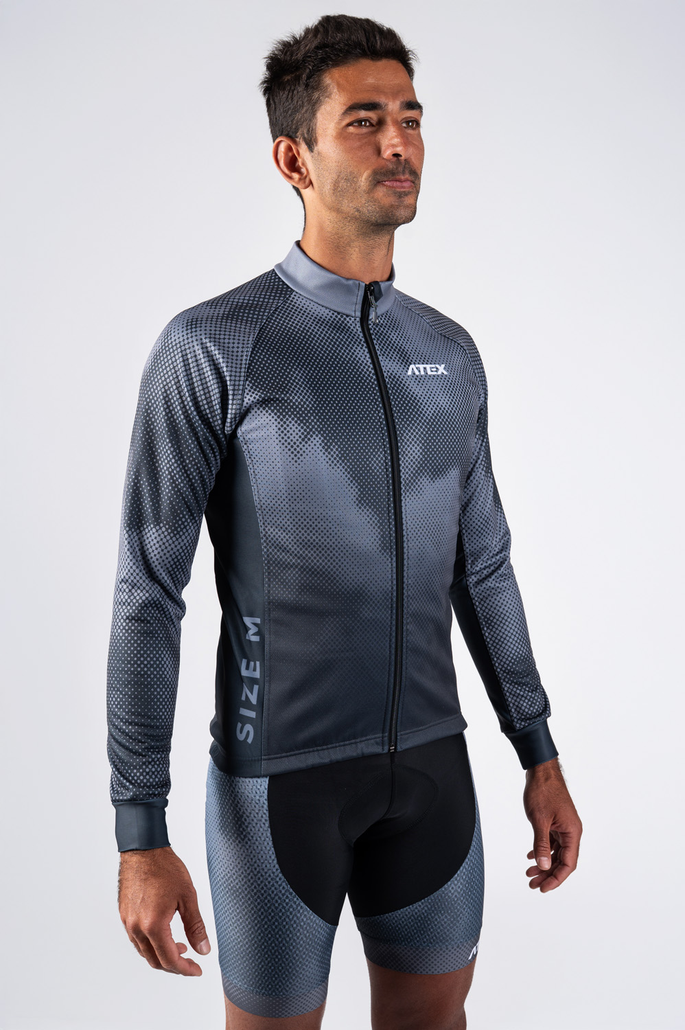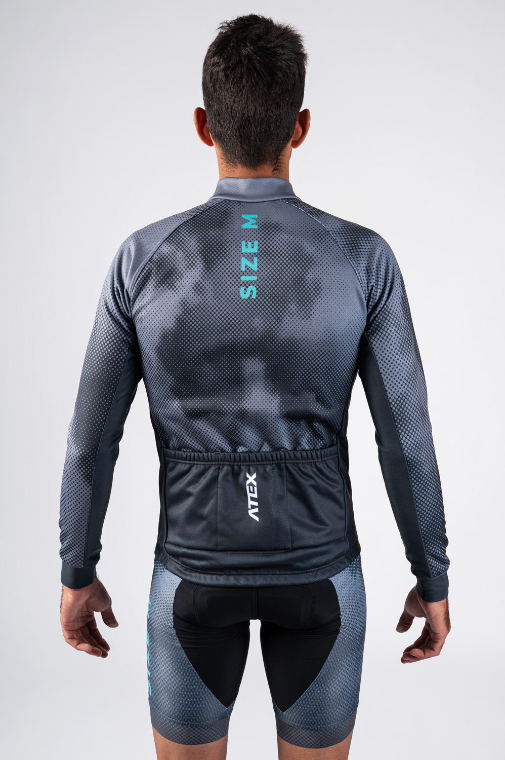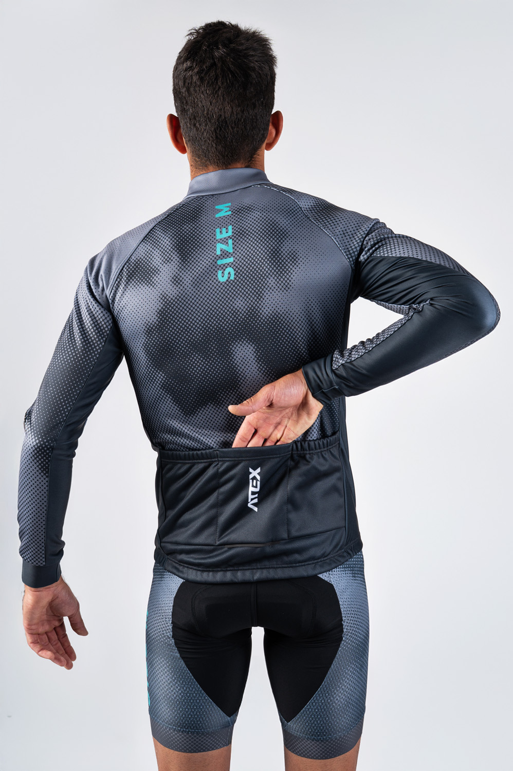 The cycling jacket has a semi-fitted cut that perfectly respects the cyclist's position on the bike. It features a full-length padded zipper, raglan sleeves finished with an elastic cuff and a silicone anti-slip elastic at the bottom edge that holds the jacket securely in place. There is a three-piece pocket on the back with a reflective element. On request, the jacket can be completed with a fourth zipped pocket.