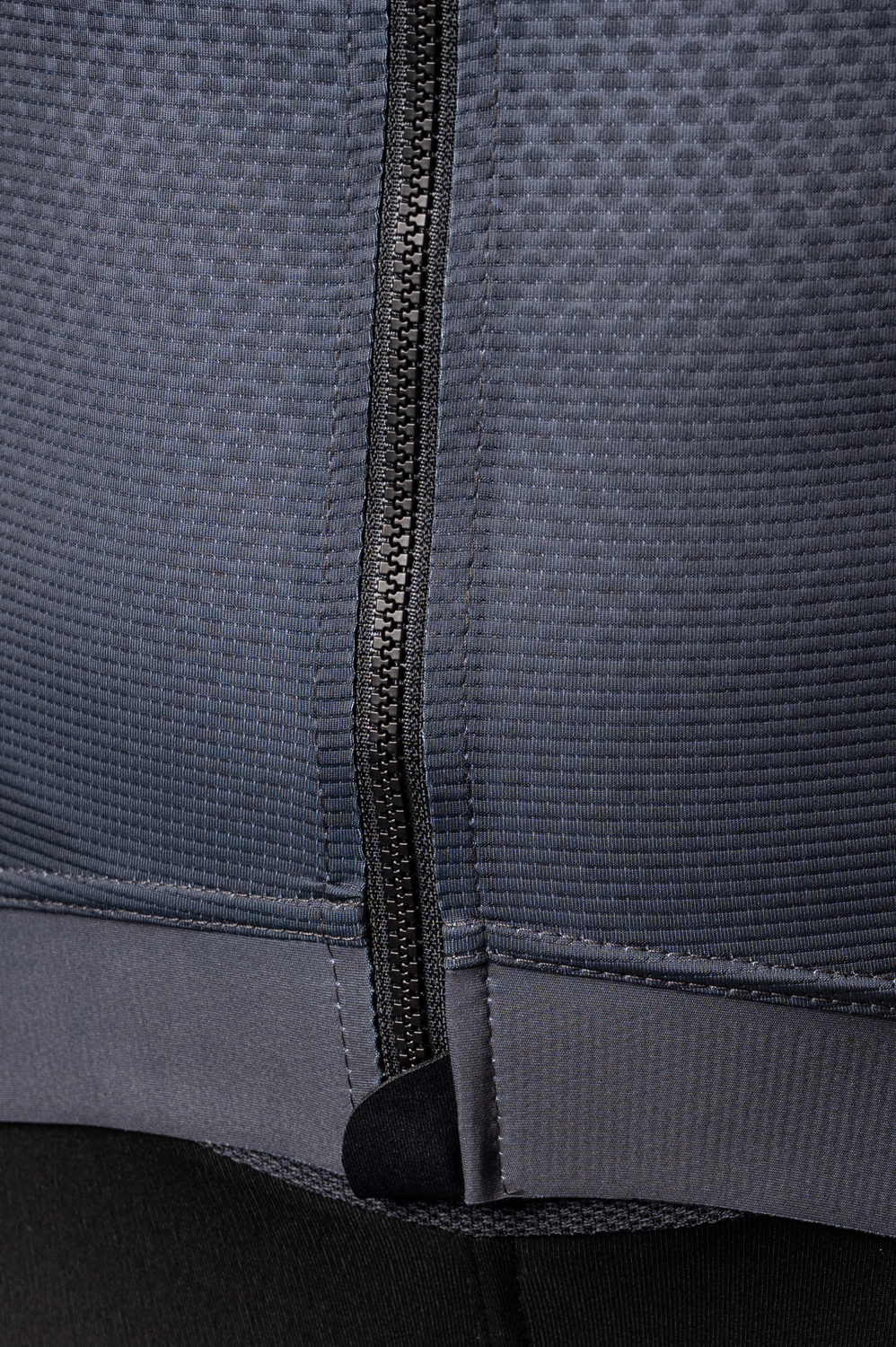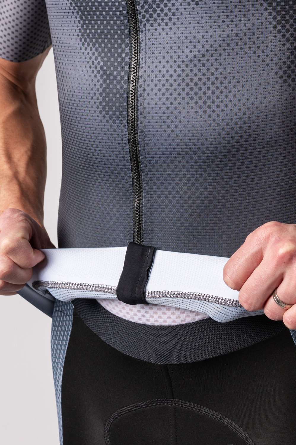 The jersey has a very close fit that follows the body and promotes aerodynamics. On the front there is a long full-length zipper with a stop slider, which ensures secure fastening even when moving. There is a low stand-up collar at the neck that does not get in the way even in a racing position. The raglan sleeves have a clean-cut finish with no additional gusseting, ensuring maximum comfort and a smooth fit to the arm. There is a three-piece pocket on the back with a reflective element to store essentials and increase safety. The bottom edge of the jersey is finished with a soft 4cm anti-slip elastic to hold the jersey securely in place.