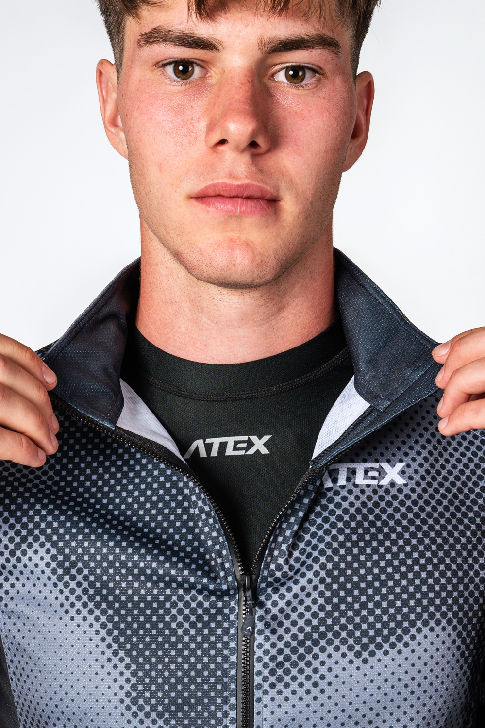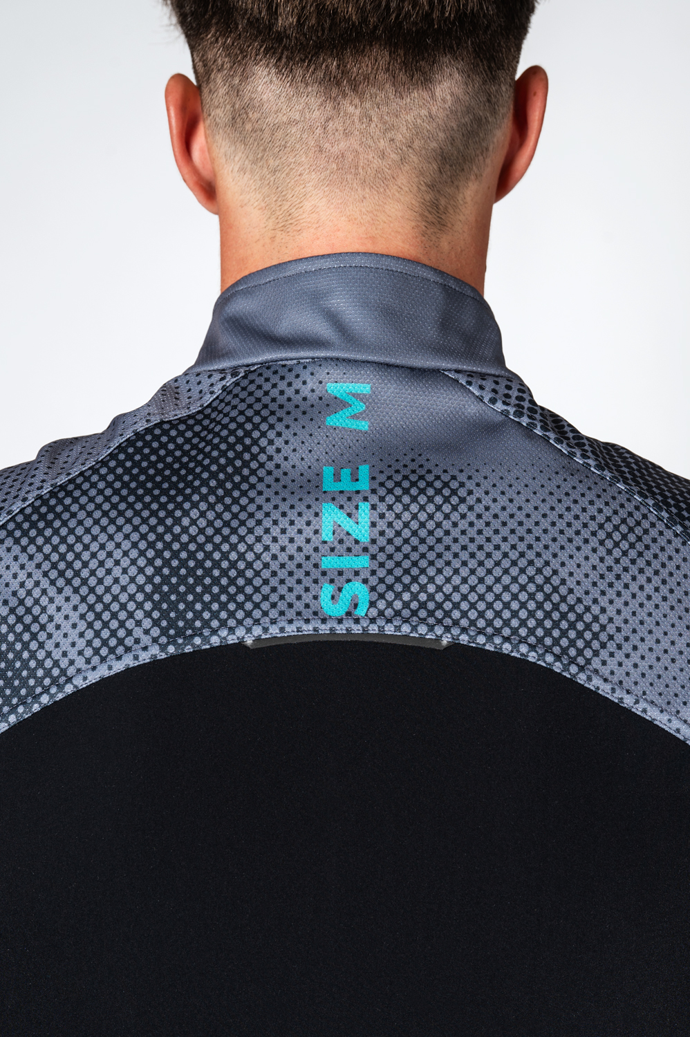 On request, a chest or back zip pocket can be added. On request, we can also print the areas shown in the picture in grey.