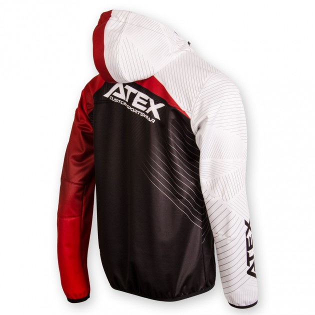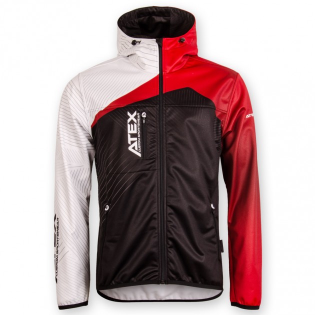 The hooded sports jacket has a semi-fitted cut, a full front zip with a top cover, one chest and two side zip pockets. The hood is lined, drawstring and printed on the inside. The jacket has set-in sleeves with shaped elbows, the sleeves are finished with elasticated cuffs. The length of the jacket is curved.
