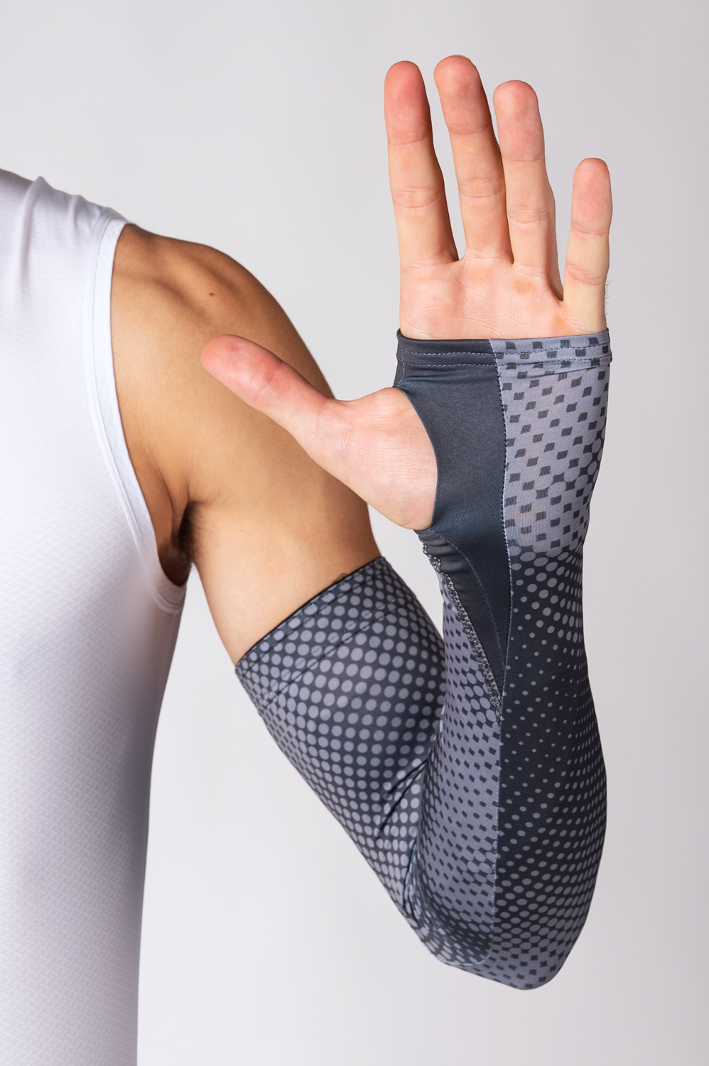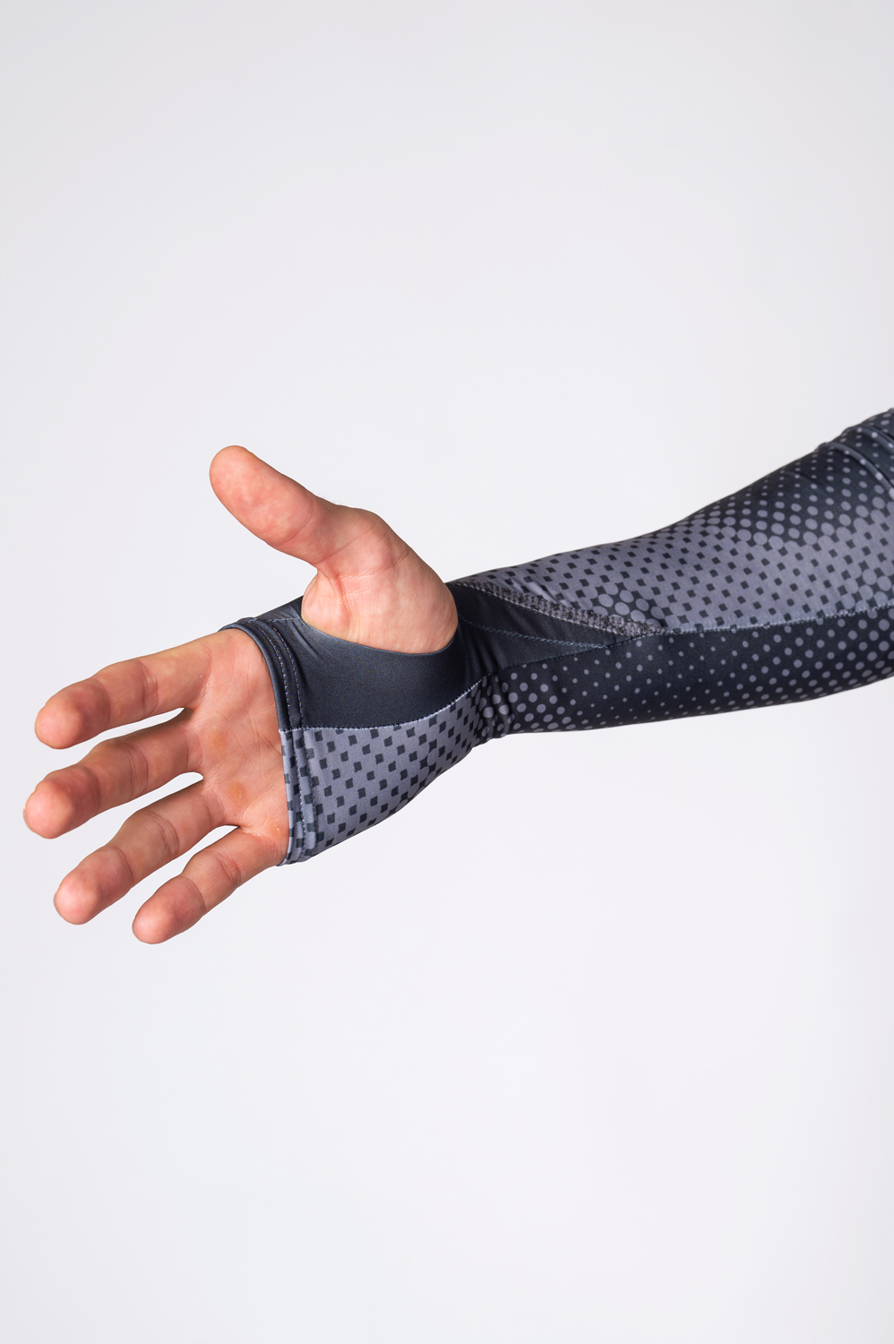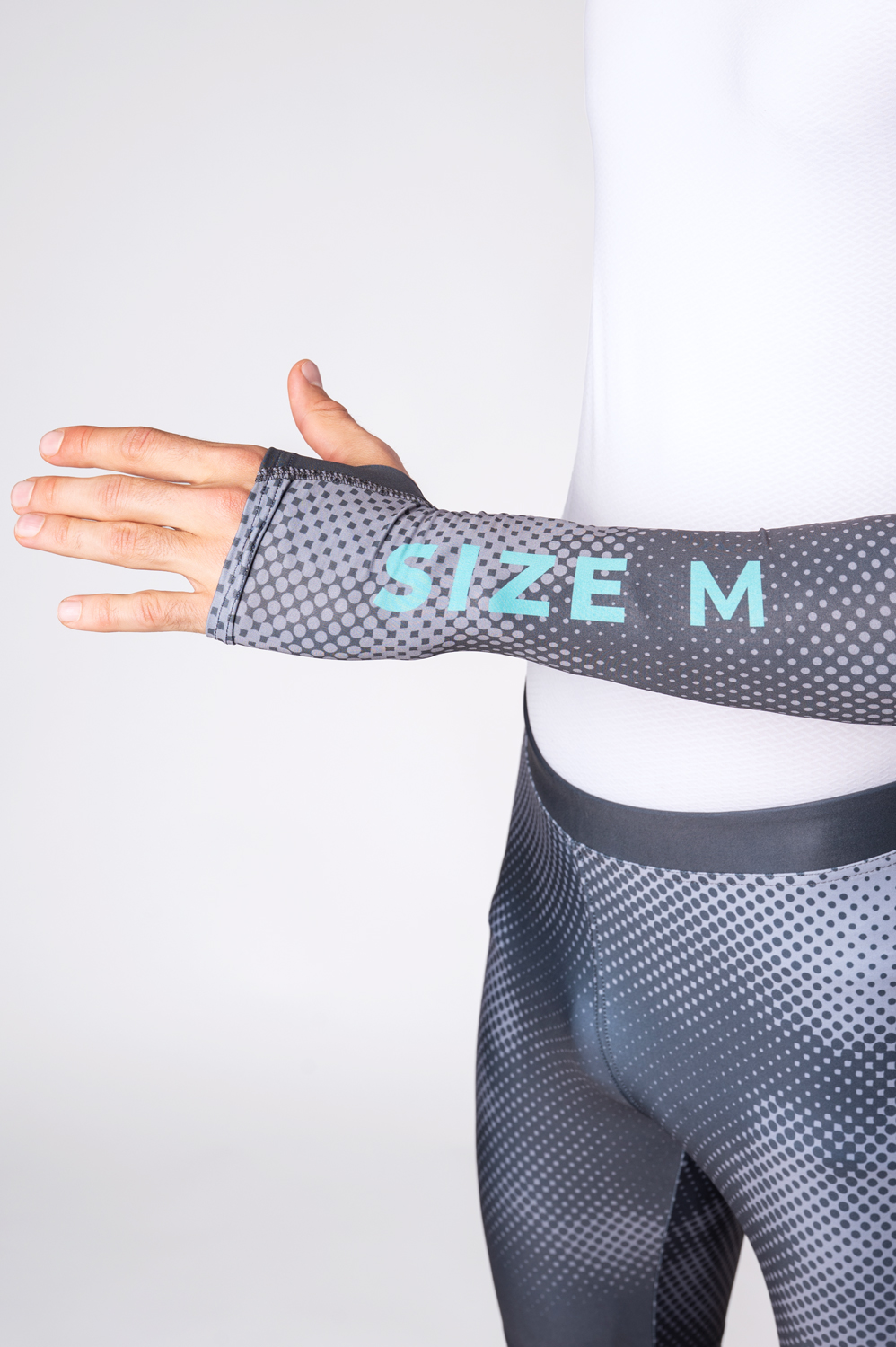 The upper part is finished with non-slip silicone rubber, which keeps the arm warmers in place even during intense movement. The lower part is equipped with a thumb hole, which allows effective coverage of the wrist and part of the palm and increases functionality during sports.
