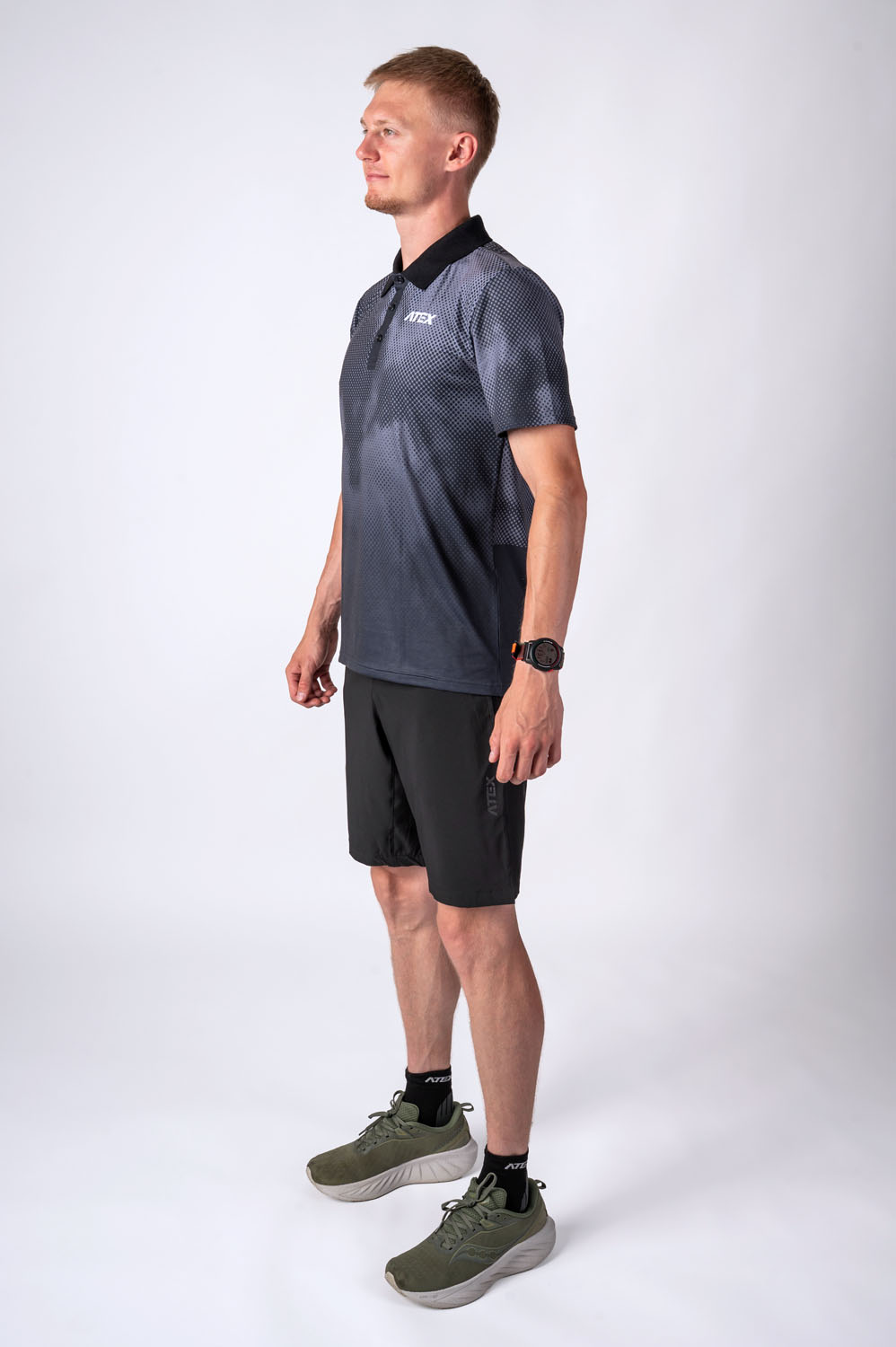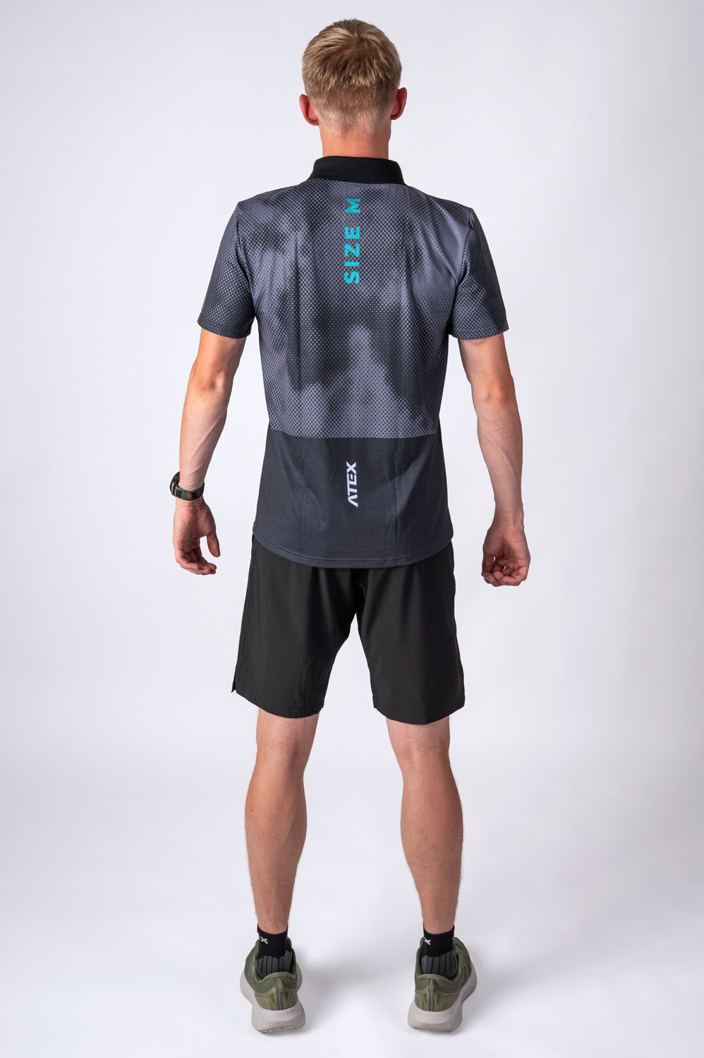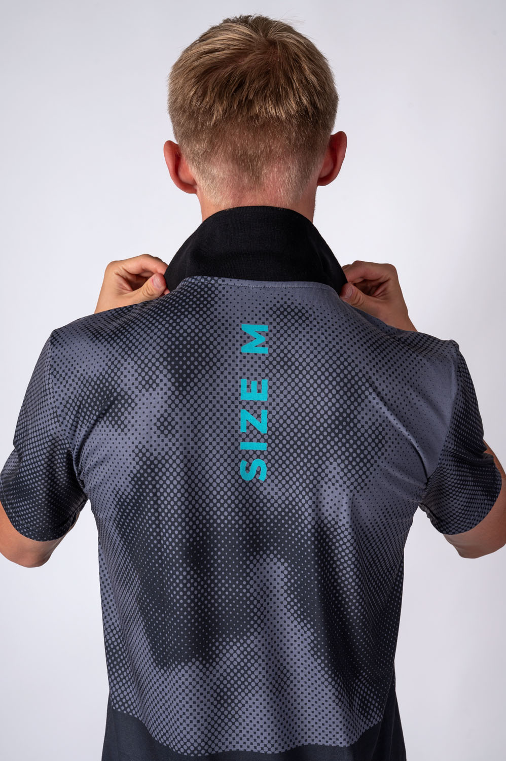 The sports shirt with collar has a semi-fitted cut with short set-in sleeves and a slightly extended back, which better covers the back when moving. There is a solid collar at the neck, which is not intended to be printed, and a three-button placket underneath.