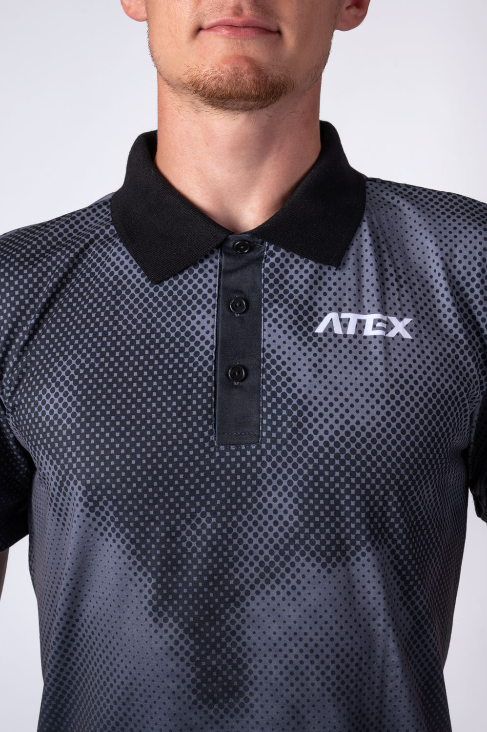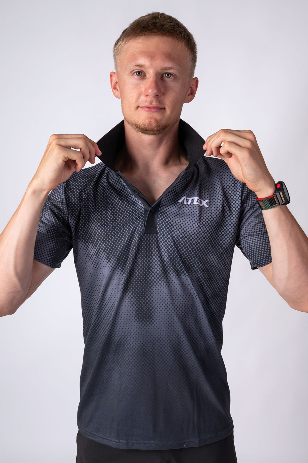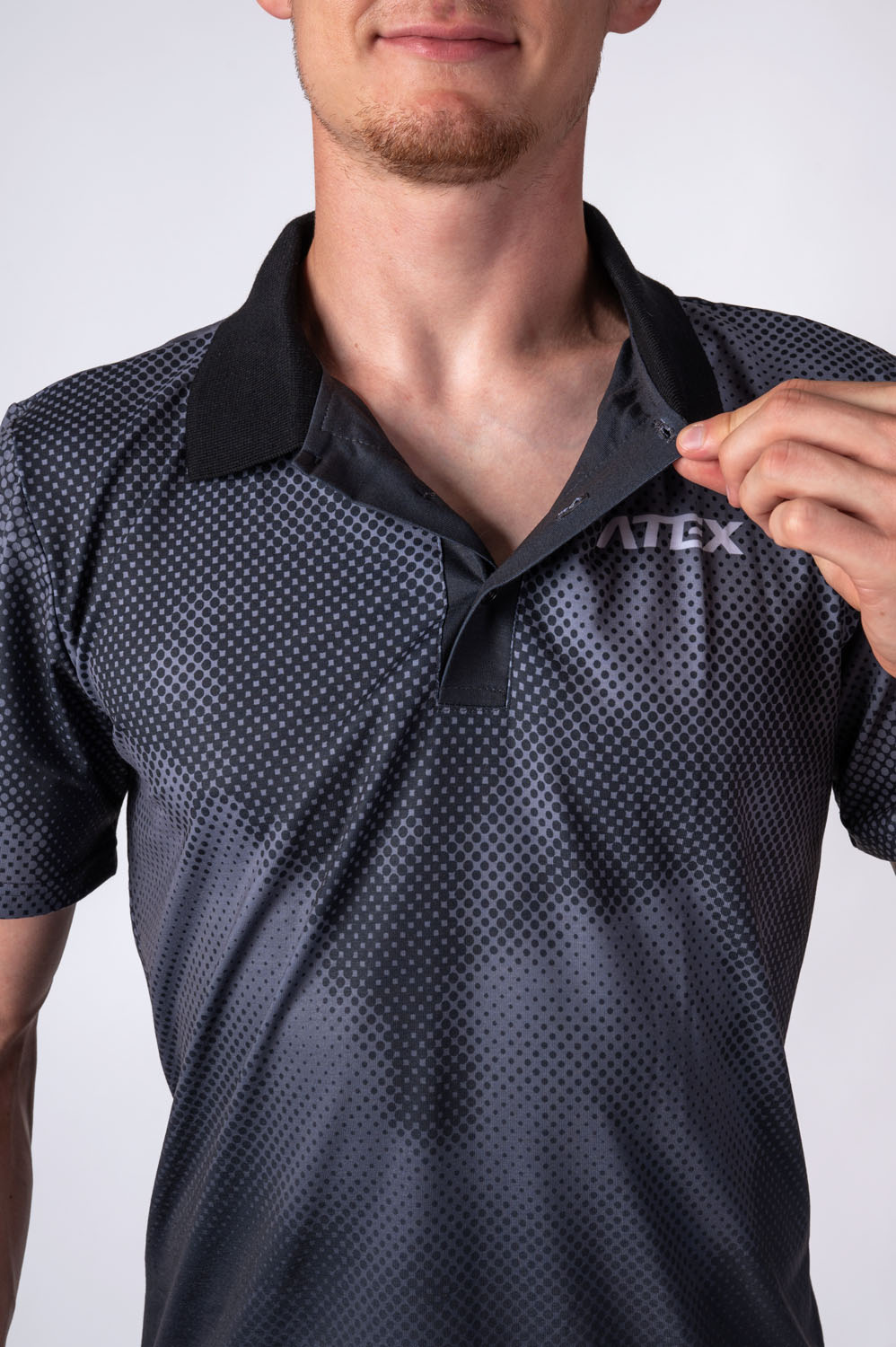 The sports shirt with collar has a semi-fitted cut with short set-in sleeves and a slightly extended back, which better covers the back when moving. There is a solid collar at the neck, which is not intended to be printed, and a three-button placket underneath.
