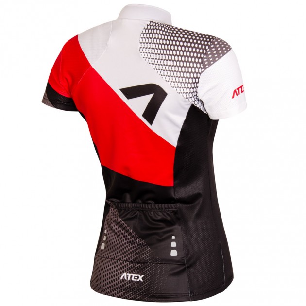 The jersey has a short zipper with a cap on the front, a lowered stand-up collar, short set-in sleeves and a two-piece pocket with reflective elements on the back. The lower length of the jersey is finished without elastic and does not stretch at the hips.